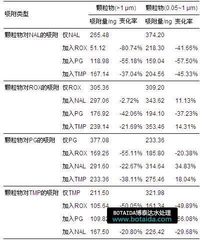 4種抗生素單獨存在和兩兩存在于水體顆粒物上的吸附情況如表 1所示.由表 1可知,4種抗生素兩兩之間的競爭吸附大部分存在相互抑制作用,但萘啶酸(NAL)和甲氧芐啶(TMP)對羅紅霉素(ROX)和青霉素(PG)在小顆粒上的吸附有一定促進(jìn)作用.