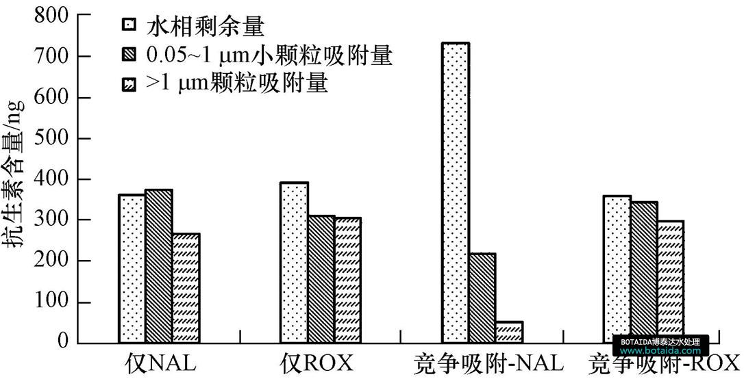 有研究發(fā)現(xiàn),不同粒徑的顆粒物在天然水體中的分布不同,對抗生素的吸附能力也不同.一方面,水體中小顆粒物(粒徑<1 μm)的百分含量較高,加之其廣大的比表面積,會大量吸附水體中殘留的抗生素,然而傳統(tǒng)飲用水處理標(biāo)準(zhǔn)中卻沒有針對小顆粒物去除效果的相關(guān)標(biāo)準(zhǔn);另一方面,粒徑越小,顆粒物越難以去除,其表面吸附的抗生素也會隨之殘留在水體中,對飲用水安全產(chǎn)生影響.基于此,本文進(jìn)行了天然水體顆粒物對4種典型抗生素(羅紅霉素(ROX)、青霉素G(PG)、甲氧芐啶(TMP)、萘啶酸(NAL))的吸附平衡實驗,研究它們兩兩之間的競爭吸附特征,并分粒徑測定不同大小顆粒物上的抗生素含量,以期對飲用水水質(zhì)標(biāo)準(zhǔn)和處理工藝的改善提供借鑒.