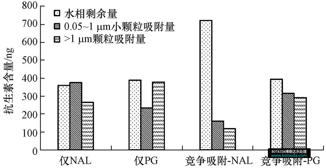 圖 1所示為萘啶酸(NAL)與青霉素G(PG)單獨存在及共同存在于水中的吸附實驗結(jié)果.通過對比水相剩余量可知,當(dāng)萘啶酸和青霉素G同時存在時,固體顆粒對青霉素G的吸附能力大于對萘啶酸的吸附能力.與抗生素單獨存在相比,萘啶酸的水相剩余量顯著增大,而青霉素G的水相剩余量則基本維持不變.可見,青霉素G的存在很大程度地抑制了顆粒對萘啶酸的吸附,但顆粒對其自身的吸附量影響甚微.這同時說明單一物質(zhì)存在時,即使吸附達(dá)到平衡,顆粒上的吸附位點卻未飽和,顆粒的吸附能力并未達(dá)到最大.
