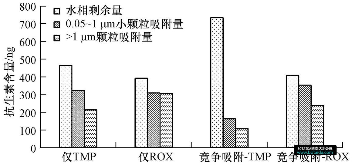 圖 4所示為甲氧芐啶(TMP)與羅紅霉素(ROX)單獨存在及共同存在于水中的吸附實驗結(jié)果.從水相剩余量角度來看,甲氧芐啶的水相剩余量大幅增加,而羅紅霉素的水相剩余量幾乎未發(fā)生變化.受羅紅霉素影響,甲氧芐啶在固液間的Kd值變小.從結(jié)構(gòu)上看,羅紅霉素屬于大環(huán)內(nèi)酯類抗生素,單位質(zhì)量的活性基團(tuán)—OH、—C O較少,吸附能力較弱;而甲氧芐啶只含苯胺基和酰胺基兩個離子型官能團(tuán),在顆粒上的吸附作用也較弱.但是,羅紅霉素的分子量較大,單個分子上的活性基團(tuán)較多,能占據(jù)更多的吸附位點,所以,顆粒對甲氧芐啶的吸附就相應(yīng)地受到了抑制.