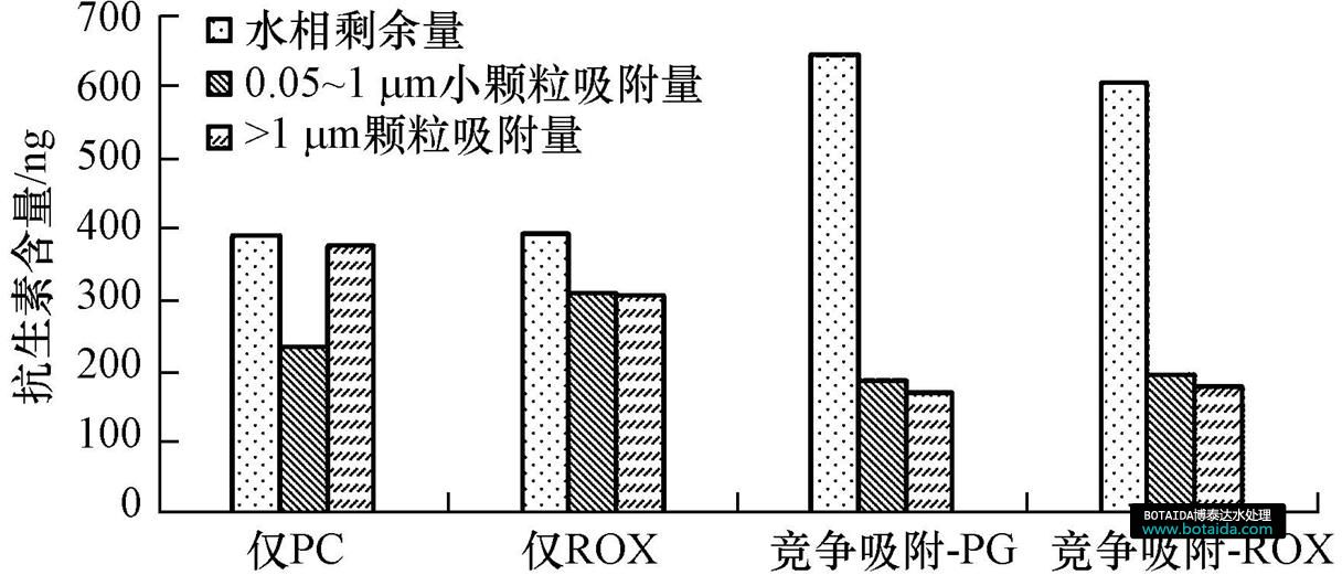 圖 6所示為青霉素G(PG)與羅紅霉素(ROX)單獨存在及共同存在于水中的吸附實驗結(jié)果.顆粒上的吸附總量有一定增加,增幅在所有6種競爭吸附中最小,這說明二者同時投加時相互抑制的現(xiàn)象比較明顯.具體到小顆粒的吸附能力及吸附量,二者降幅明顯且羅紅霉素降幅更大,競爭吸附平衡后二者吸附量相當(dāng).小顆粒吸附總量由309.20 ng上升至379.48 ng,漲幅為22.8%,依然存在吸附未達(dá)飽和的現(xiàn)象.結(jié)構(gòu)上看,二者的活性基團(tuán)不同,不會造成吸附位點的競爭,而且相互之間不發(fā)生復(fù)合反應(yīng),不影響抗生素本身的組成,但可能由于羅紅霉素分子量較大,占用空間較大,因此,產(chǎn)生了二者顆粒上的吸附量均減少但總量增多的結(jié)果.
