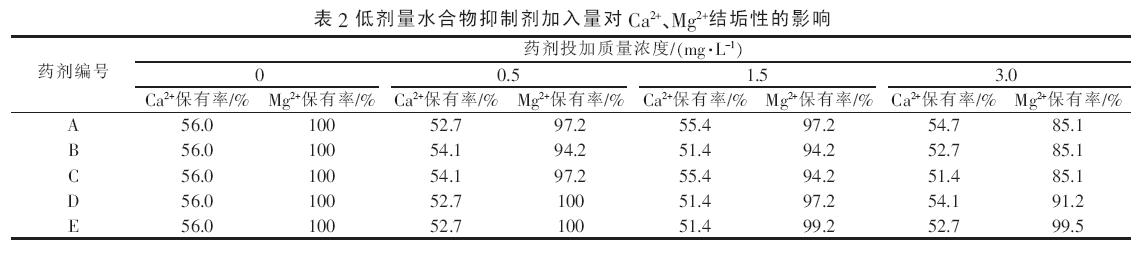 為驗證低劑量水合物抑制劑對油田污水結(jié)垢性的影響,按表1 配制強結(jié)垢型的油田污水,并添加質(zhì)量分數(shù)為0.5%~3%低劑量水合物抑制劑進行試驗,結(jié)果見表2?試驗表明,對于具有較強結(jié)垢趨勢的油田水質(zhì),加入水合物抑制劑后,Ca2+的保有率比空白稍有下降,但不顯著,即水合物抑制劑的加入對油田污水碳酸鈣垢的沉積不會造成太大的影響?除了E外, 隨著A~D 水合物抑制劑用量增加,Mg2+的保有率有不同程度的下降, 表現(xiàn)出對油田污水中Mg2+的沉積有一定的促進作用?