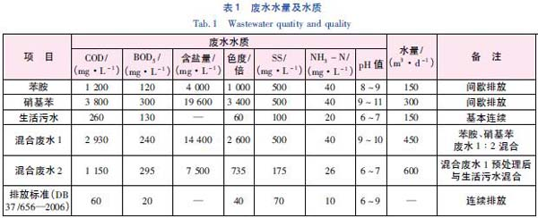 廢水來自還原和精制過程,主要分兩部分,其中苯胺進水pH 值為8~9,廢水量為150 m3 /d; 硝基苯進水pH 值為9~11,廢水量為300 m3 /d; 混合廢水量為450 m3 /d,COD 約為3 000 mg /L,含鹽量高,色度較高,氨氮含量高,是一種濃度高、成分復雜、難降解的有機化工廢水
