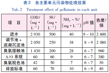 本工程經(jīng)過近2 個月的調試運行后,出水水質穩(wěn)定,COD 總去除率為98.6%,達到設計要求。各單元的處理效果見表2。