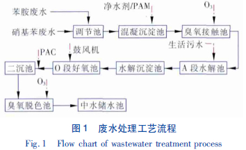苯胺、硝基苯綜合廢水中含有大量難降解有機物,COD 值較高,可生化性極差(一般B /C 值為0 ~0.1) ,屬于高含鹽廢水,因此綜合考慮多種因素,決定采用物化與生化處理相結合的工藝。以混凝沉淀和臭氧氧化作為預處理單元,不會提高廢水的含鹽量,但可以提高廢水的可生化性,使A/O 生物系統(tǒng)處理效率大幅提高; 在末端再進行臭氧氧化脫色處理可確保出水色度達標。工藝流程見圖1。