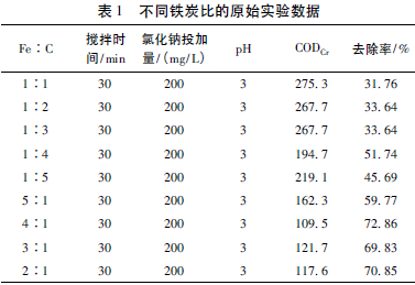 控制其他反應(yīng)條件不變,氯化鈉投加量為200 mg/L,pH值為3,攪拌時(shí)間為30 min,將鐵的投加量固定為20 g/L,在不同的鐵炭比(Fe∶C=5∶1、4∶1、3∶1、2∶1、1∶1、1∶2、1∶3、1∶4、1∶5) 條件下進(jìn)行反應(yīng)。測定各水樣CODCr值,計(jì)算CODCr的去除率,結(jié)果見表1。