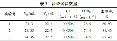 由正交試驗(yàn)的數(shù)據(jù)分析已知: 本實(shí)驗(yàn)的最佳條件為Fe∶C =1∶3,NaCl 的投加量為200 mg/L,pH為2,攪拌反應(yīng)時(shí)間為45 min。用該條件處理卷煙廠的焦油廢水,進(jìn)行三組平行實(shí)驗(yàn),測定這三個(gè)水樣的CODCr值,計(jì)算其去除率,從而驗(yàn)證該條件是否最佳。實(shí)驗(yàn)數(shù)據(jù)見表3。