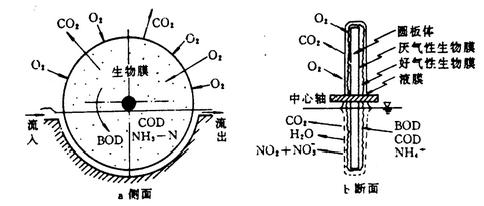 生物轉(zhuǎn)盤(pán)是利用微生物分解污水中的有機(jī)物來(lái)降低污水的COD和BOD,其原理是利用轉(zhuǎn)盤(pán)的轉(zhuǎn)動(dòng),使附著在轉(zhuǎn)盤(pán)上的微生物在水和空氣來(lái)回循環(huán)。在水中的過(guò)程微生物的氧化作用分解水中的有機(jī)物,而在空氣過(guò)程中微生物獲取空氣中的氧氣,用于氧化作用。通過(guò)不斷循環(huán)達(dá)到凈水目的。