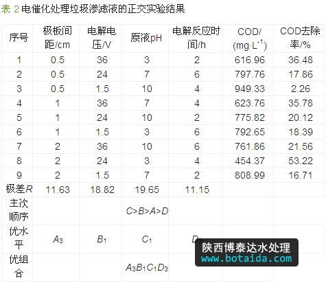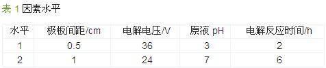 設計極板間距(A)、電解電壓(B)、原液pH(C)和電解反應時間(D)4因素3水平L9 (34)正交實驗表,如表 1所示,實驗結(jié)果列于表 2。