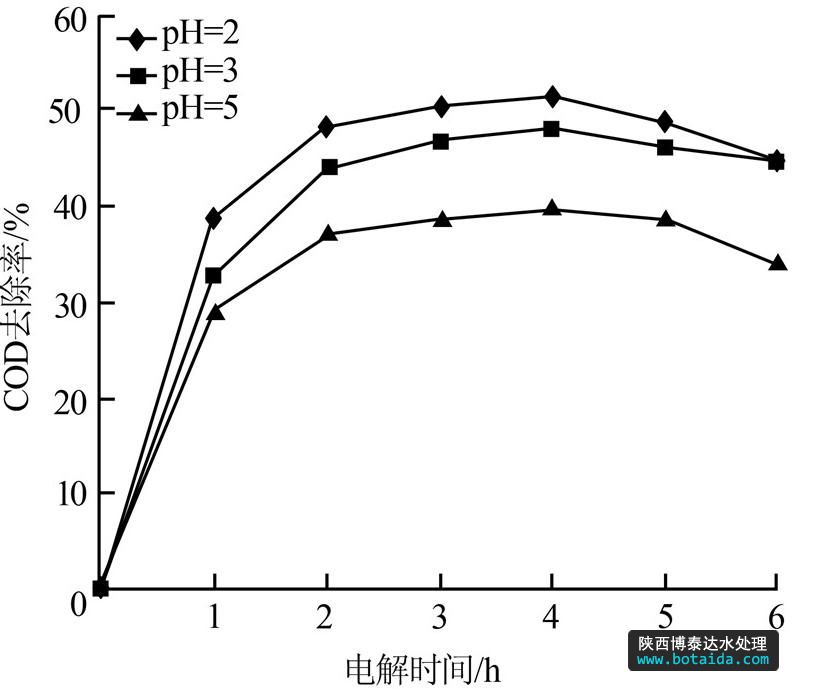 綜上不難發(fā)現(xiàn),當滲濾液的pH分別為2、3、5 時,隨電解時間的延長,COD去除率進一步增加,但超過4 h后去除率基本不變;當電解電壓為24、36 V,電解4 h時,COD去除率達到最大;極板間距為1.5 cm時,電解約4 h COD去除率也達到最大值。這說明采用Ir-Ta-Sn摻雜電極對垃圾滲濾液進行電催化降解時,電解時間不宜超過4 h,此時COD去除率已達到最大值;電解時間繼續(xù)延長,垃圾滲濾液中的COD不但不降低,反而會有一定程度的回升。因此合理控制電化學氧化時間,可以減少能耗,并提高COD去除率。