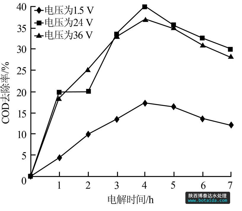 (2)當電催化氧化時間達到約4h時,對垃圾滲濾液的COD去除率基本達到最大;當電解電壓為24 V或36 V時,電催化氧化對COD的去除效果有明顯提高。