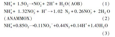 CANON(Completely Autotrophic Nitrogen Removal over Nitrite,CANON)工藝是一種新型的生物脫氮工藝,其脫氮原理為:氨氧化菌(Ammonia-Oxidizing Bacteria,AOB)利用溶解氧(Dissolved Oxygen,DO)將NH4+-N氧化成NO2--N,厭氧氨氧化菌(Anaerobic Ammonium Oxidation,ANAMMOX)利用AOB提供的基質(zhì)和創(chuàng)造的缺氧環(huán)境對NH4+-N和NO2--N進(jìn)行轉(zhuǎn)化從而實(shí)現(xiàn)脫氮.反應(yīng)過程如下: