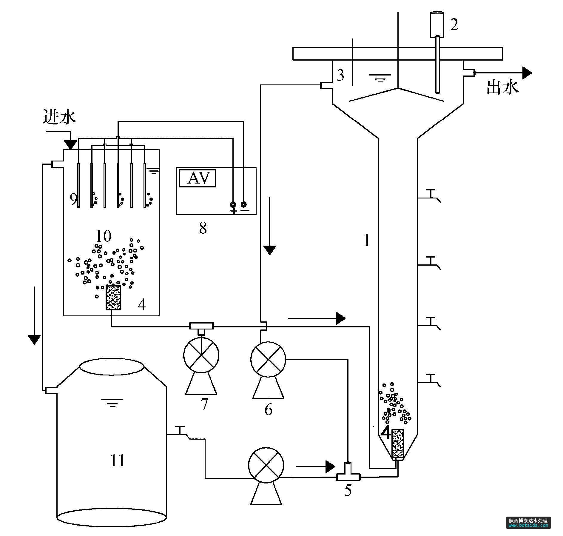 圖1 電絮凝-CANON工藝裝置示意圖(1.EGSB,2.溶解氧儀,3.溫度計(jì),4.曝氣頭,5.三通,6.蠕動泵,7.空氣泵,8.電源,9.鋁板,10.電絮凝反應(yīng)器,11.調(diào)節(jié)池)