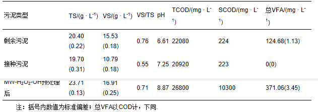試驗(yàn)所用剩余污泥取自北京清河污水處理廠,取回后靜置濃縮,置于4 ℃保存.接種污泥取自北京小紅門(mén)污水處理廠,為中溫(35℃)厭氧消化出泥.試驗(yàn)前污泥過(guò)18目標(biāo)準(zhǔn)篩以除去大顆粒雜質(zhì).試驗(yàn)采用MW-H2O2-OH預(yù)處理工藝(Wang et al., 2015;Wang et al., 2009;Xiao et al., 2012;王亞煒,2009;肖慶聰?shù)龋?012;閻鴻,2010),其操作條件如下:加入5 mol · L-1 NaOH溶液,調(diào)節(jié)樣品pH至11,600 W微波功率輻射樣品,升溫至80 ℃,然后按m(H2O2)/m(TS)=0.2加入30%的過(guò)氧化氫溶液,繼續(xù)輻射升溫至100℃,結(jié)束.本試驗(yàn)通過(guò)微波-過(guò)氧化氫-堿預(yù)處理達(dá)到堿性環(huán)境,以抑制產(chǎn)甲烷過(guò)程.試驗(yàn)所用污泥的主要性質(zhì)見(jiàn)表 2.污泥經(jīng)過(guò)MW-H2O2-OH預(yù)處理后,添加100 mg · L-1過(guò)氧化氫酶(Sigma),混合完全攪拌一定時(shí)間以便將殘留過(guò)氧化氫分解完全,之后按照I/S(Inoculum to Substrate,揮發(fā)性固體濃度VS/VS)為0.07的比例進(jìn)行接種污泥接種.之后按照響應(yīng)面法安排進(jìn)行試驗(yàn),試驗(yàn)中采用的蛋白酶酶活為20萬(wàn)U · g-1(江蘇銳陽(yáng)生物科技有限公司).