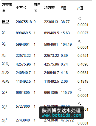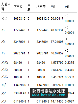 式中,Y為響應(yīng)值;X1、X2、X3為自變量編碼值;B0為常數(shù)項(xiàng);B1、B2、B3為線性系數(shù);B12、B13、B23為交叉項(xiàng)系數(shù);B11、B22、B33為二次項(xiàng)系數(shù);e為誤差. 對(duì)模型進(jìn)行方差分析,并通過(guò)模型得到基于微波-過(guò)氧化氫-堿預(yù)處理的污泥水解酸化的優(yōu)化工藝條件和最大總VFA濃度.