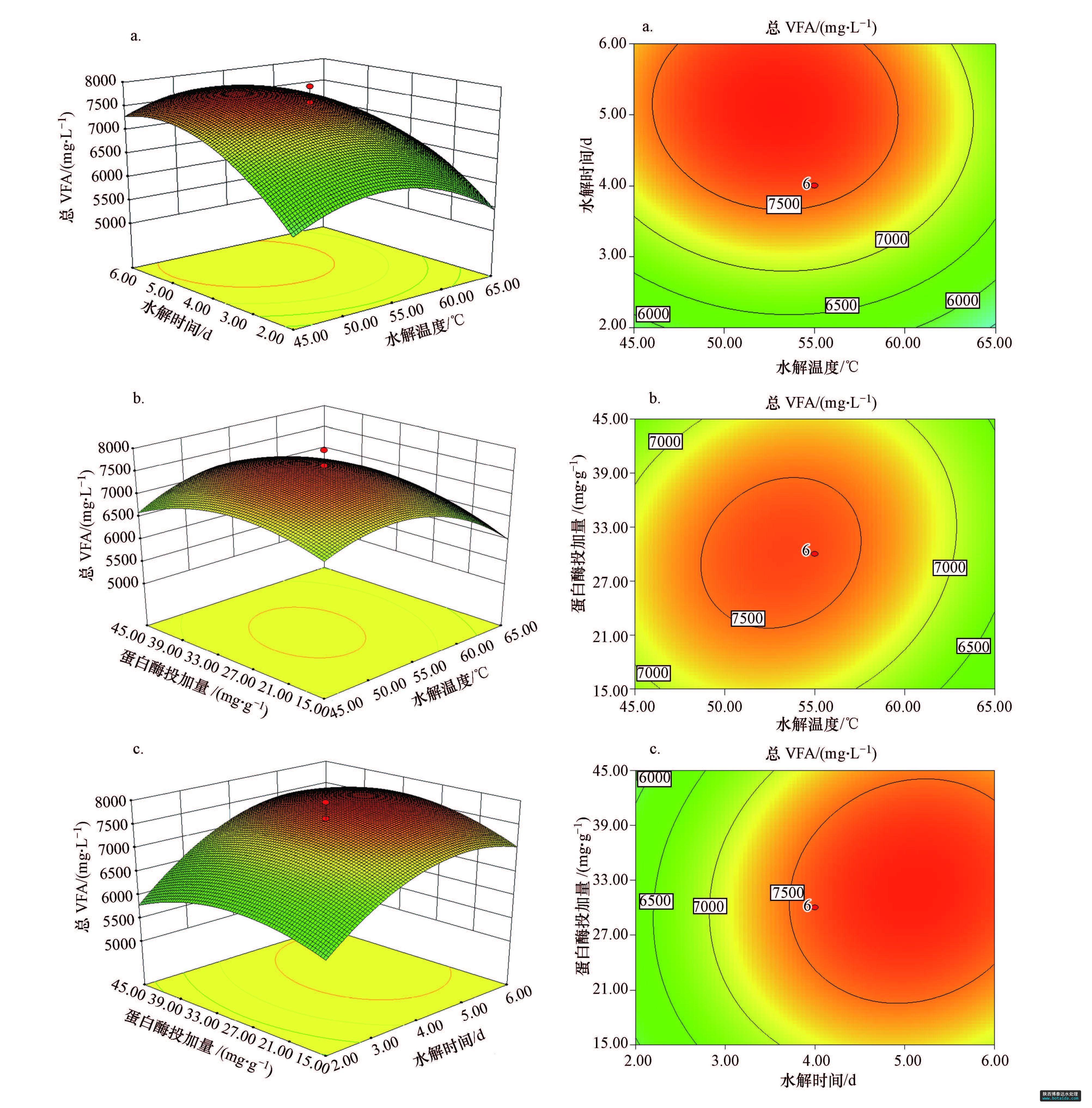 圖1 不同因素對(duì)總VFA濃度(以COD計(jì))影響的響應(yīng)曲面圖和等高線圖(a.水解酸化時(shí)間和水解溫度,b.蛋白酶投加量和水解溫度,c.蛋白酶投加量和水解酸化時(shí)間)