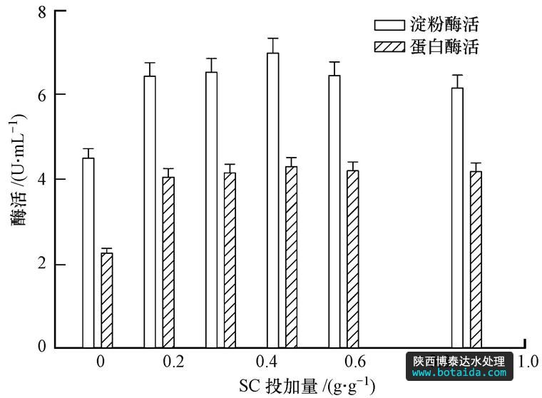 SC對污泥酶水解影響:設(shè)立2批次實(shí)驗(yàn)(每批次包括6個(gè)實(shí)驗(yàn)組),各批次均取400 mL污泥,分別投加蛋白酶、淀粉酶0.06 g · g-1(以TS 計(jì),下同),SC以粉末形式投加,SC的投加量分別為0、0.144、0.288、0.432、0.576、0.864 g · g-1,隨后向各錐形瓶中通入氮?dú)饧s4 min以完全驅(qū)除殘留空氣,加塞置于50℃水浴振蕩器上反應(yīng),4 h后取樣測定水解產(chǎn)物及蛋白酶和淀粉酶的活性,并進(jìn)行分析.同時(shí)設(shè)定空白對照組,除不加酶和SC外,其它條件與實(shí)驗(yàn)組均相同.