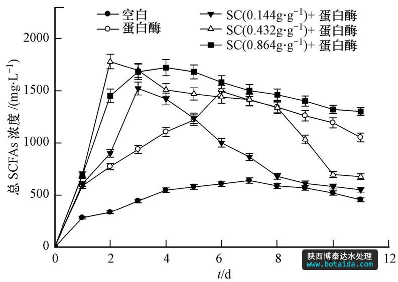 SC對污泥產(chǎn)酸影響:設(shè)立4組實(shí)驗(yàn),各組均取400 mL污泥,先投加蛋白酶0.06 g · g-1,SC以粉末形式投加,每組SC的投加量分別為0、0.144、0.432、0.864 g · g-1,隨后向各錐形瓶中通入氮?dú)饧s4 min以完全驅(qū)除殘留空氣,加塞置于50℃水浴振蕩器上反應(yīng),反應(yīng)裝置在此條件下反應(yīng)12 d,每天對酸化產(chǎn)物SCFAs進(jìn)行測定.同時(shí)設(shè)定空白對照組,除不加酶和SC外,其它條件與實(shí)驗(yàn)組均相同.