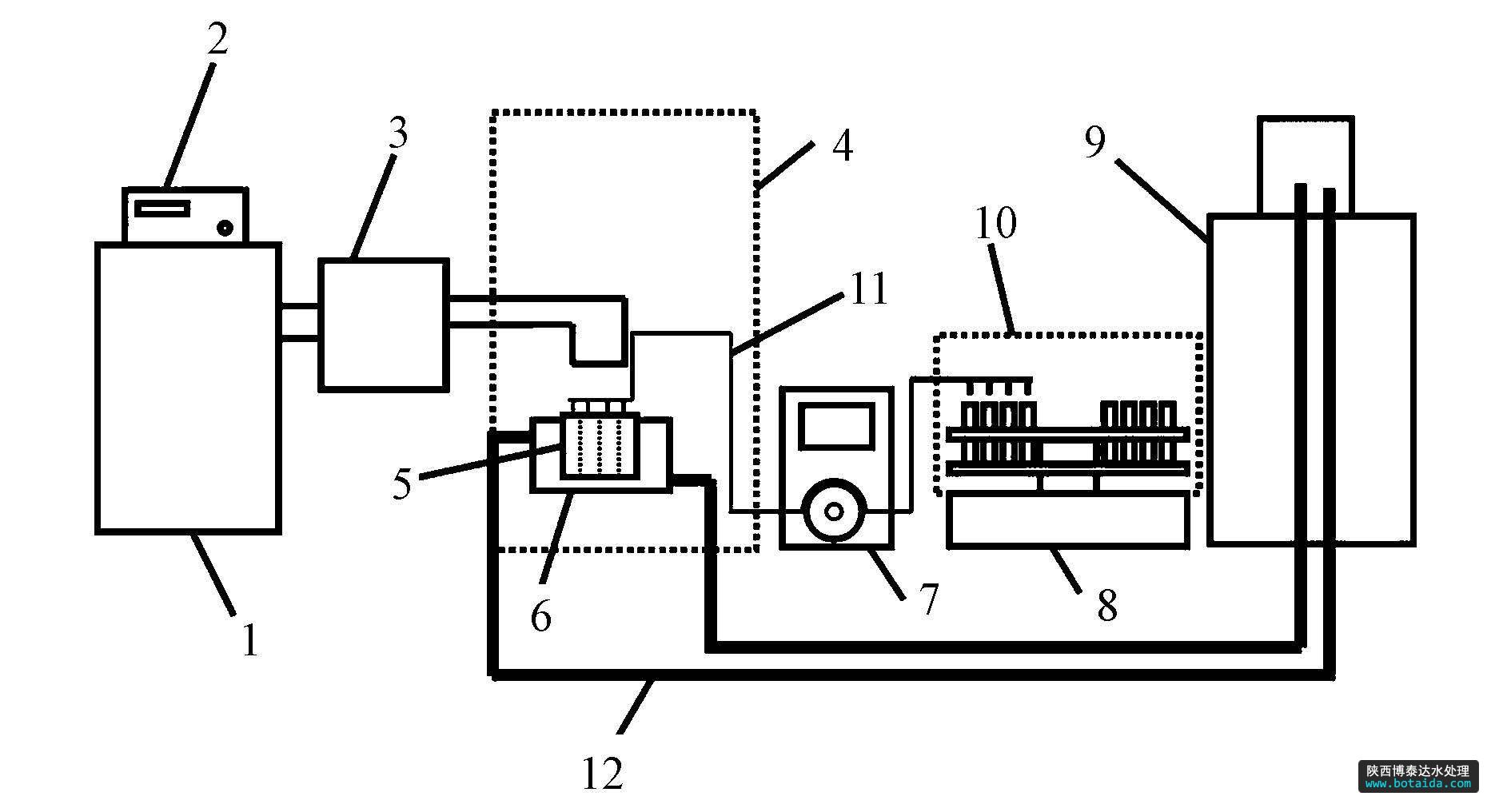 圖1 單線態(tài)氧捕獲裝置示意圖(1.光源,2.光強調(diào)節(jié)器,3.單色儀,4.暗室,5.多通量反應(yīng)杯,6.冷阱,7.恒流泵,8.部分收集器,9.恒溫循環(huán)水,10.遮光罩,11.采樣管路,12冷凝水管路)