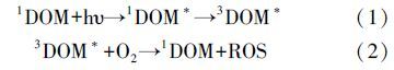溶解性有機質(zhì)(DOM)含有發(fā)色基團,是重要的天然光敏劑,在紫外輻射或太陽光照射下,單線態(tài)(state DOM singlet,1DOM)分子吸收光能先轉(zhuǎn)化為激發(fā)單線態(tài)(excited state DOM singlet,1DOM*),進而轉(zhuǎn)化為激發(fā)三線態(tài)(excited state DOM triplets,3DOM*),進一步與溶解氧分子發(fā)生一系列反應(yīng),產(chǎn)生活性氧物質(zhì)(reactive oxygen species,ROS),如羥基自由基(hydroxyl radical,· OH)、單線態(tài)氧(singlet oxygen,1O2)、超氧化物(superoxide,O2-)等(見反應(yīng)式(1)、(2.這些活性氧物質(zhì)可以誘導(dǎo)有機污染物光降解,同時,DOM也會與目標化合物競爭光吸收,或猝滅目標化合物的激發(fā)態(tài),DOM對有機污染物的光解具有光敏化和光屏蔽雙重作用(Chen et al., 2009;,這與DOM的來源、組成、化學(xué)結(jié)構(gòu)等特點密切相關(guān).因此,溶解性有機質(zhì)在水生生態(tài)系統(tǒng)光化學(xué)中扮演重要角色,可以影響有機污染物的環(huán)境行為和生態(tài)風(fēng)險.