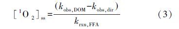 一般采用單線態(tài)氧平衡濃度(singlet oxygen steady-state concentrations,[1O2]ss)對腐殖酸產(chǎn)生1O2的產(chǎn)量進行表征.FFA作為對1O2的捕獲劑,其降解的快慢可以反映產(chǎn)生1O2的速率.[1O2]ss可由FFA降解速率常數(shù)kobs,DOM和FFA自身光降解速率常數(shù)kobs,dir經(jīng)公式(3)計算得到.