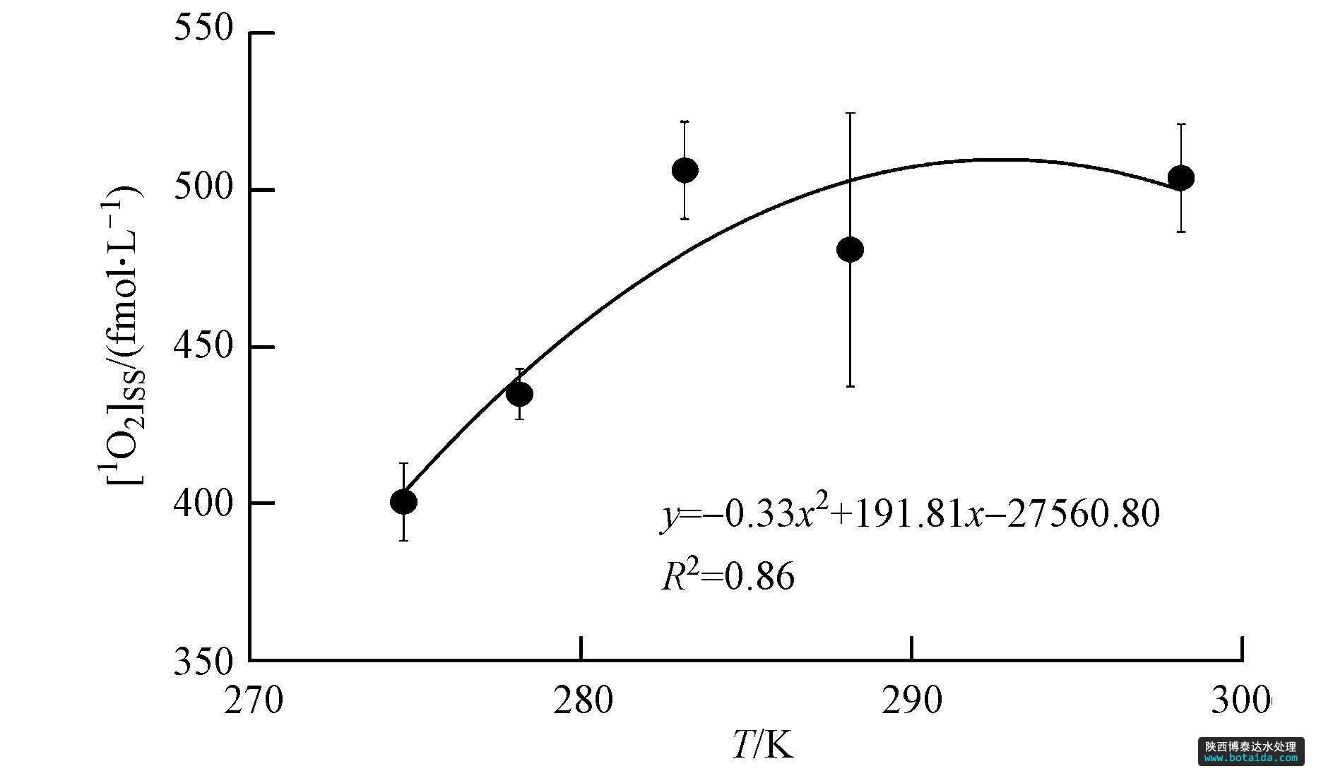 為模擬實際水環(huán)境,本研究所選溫度段為1.5、5、10、15和25 ℃,[1O2]ss與T(T為絕對溫度)的關(guān)系如圖 4所示.實驗溫度范圍內(nèi),[1O2]ss值為400~506 fmol · L-1,隨T增大呈增長趨勢.分析推測溫度升高,溶液中分子活躍度增強,使得HA吸收光子能量發(fā)生能級躍遷生成三線激發(fā)態(tài)(3HA*)的速率增大,使得更多的氧分子獲得3HA*轉(zhuǎn)移的能量形成1O2.