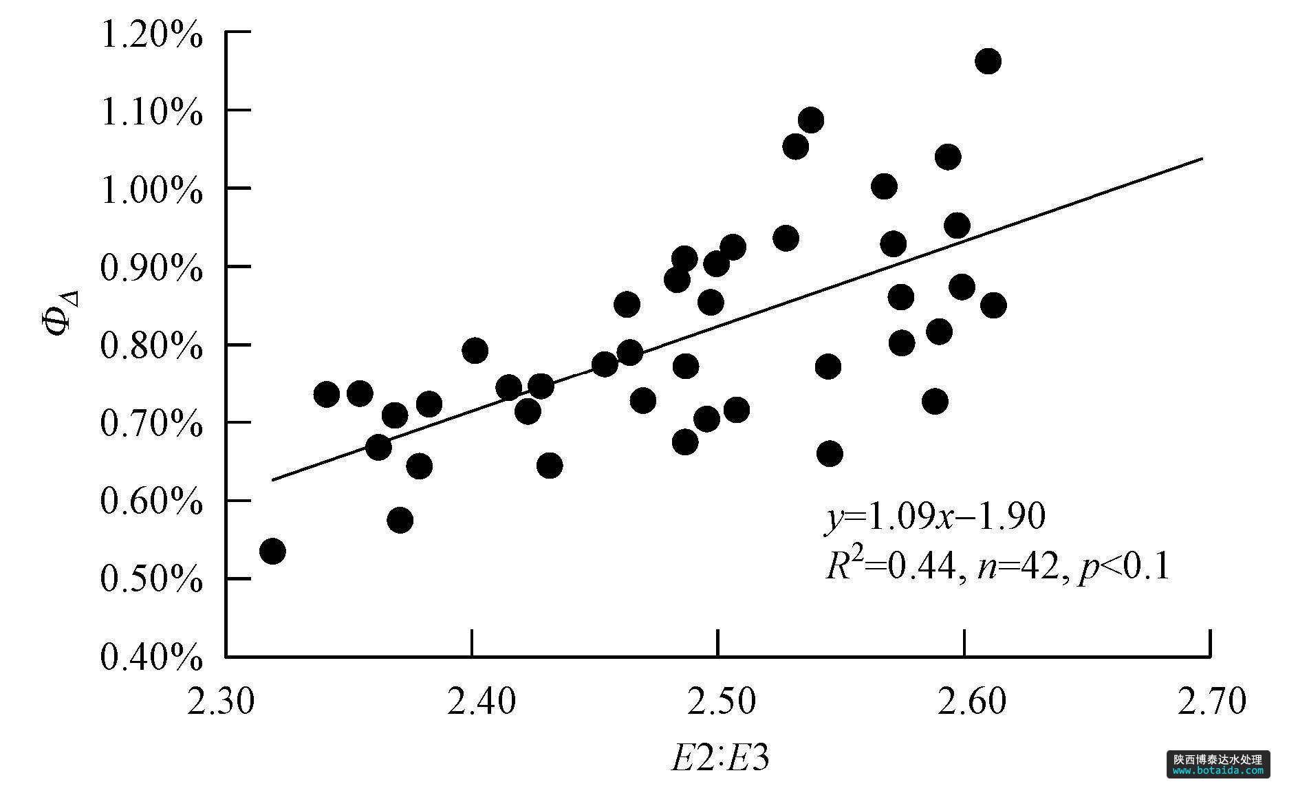 盡管腐殖酸結(jié)構(gòu)、性質(zhì)的復(fù)雜性對其分子規(guī)模下光化學(xué)模型的建立造成了很大阻礙,但眾多研究表明了用光譜數(shù)據(jù)對腐殖酸光化學(xué)反應(yīng)速率進行預(yù)測的可能性.例如,一些研究結(jié)果表明:熒光特性指標與DOM的平均分子量負相關(guān)(Coelho et al., 2011),小分子量的HA光敏化降解2,4,6-三甲基苯酚的效率比大分子量的高(Halladja et al., 2007).Dalrymple et al., 2010)用測定得到的ФΔ與E2:E3的關(guān)系式對ФΔ進行預(yù)測計算,結(jié)果與實際值的誤差為-3%~60%.