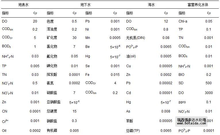 式(2)~(7)中,cj為指標j的實測值或標準值;cj0為設定的指標j的參照值,4類水體95項指標的參照值cj0和室內(nèi)、外空氣29項指標的參照值cj0分別如表 1和表 2所示.