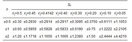若n固定,將Sc對x′j求導,并令S′c=0,得x′j=-1≈0.4142時,Sc有極小值0.5828n.由于變換式(2)~(7)中,對多數(shù)指標只取n=±2、±1、±0.5.而公式(10)和式(11)中,x′j 取值范圍為x′j∈[0,0.5](對水體),x′j∈[0,0.4](對空氣).當n為上述值時,x′j 分別取為如表 4所示值時,由式(21)計算得靈敏度Sc值如表 4所示.
