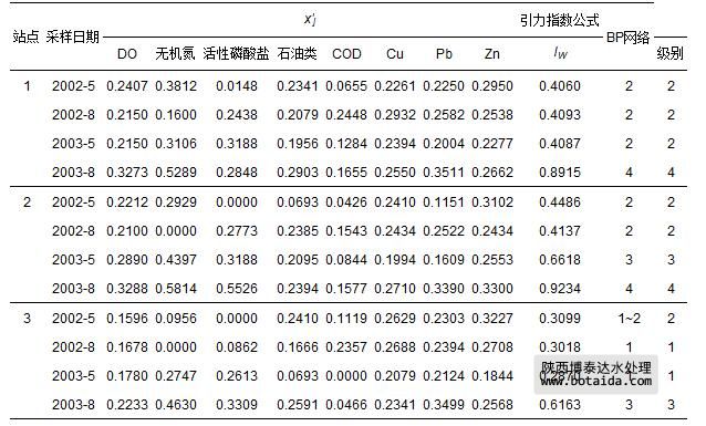 珠江口2002—2003年3個站點8項海水指標監(jiān)測數(shù)據(jù)cj(李占東等,2005)如表 7所示.由式(1)和式(4)計算出的指標規(guī)范值x′j如表 8所示.由于站點1的2003-8和站點2的2002-5,2002-8和2003-5樣本不同指標的規(guī)范值x′j相差較大,因而需用式(13)對引力指數(shù)值進行加權計算外.其余日期采樣點則視各指標為等權,再用式(10)和式(12)計算得到各站點海水水質引力綜合指數(shù)值,并根據(jù)表 3中海水水質引力指數(shù)分級標準做出評價結果(表 8).表中還列出文獻(李占東等,2005)中用BP人工神經(jīng)網(wǎng)絡評價法做出的評價結果.可以看出,全部12個樣本2種方法的評價級別完全一致.