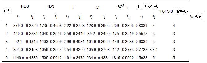 表 6 豐縣5個地下水監(jiān)測點的指標監(jiān)測數(shù)據(jù)cj(mg · L-1)及其規(guī)范值 x′j和評價結果