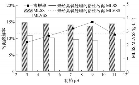 在污泥臭氧處理過程中,臭氧投加量和活性污泥的初始pH會(huì)影響污泥的溶解率及有機(jī)質(zhì)、氮、磷等物質(zhì)的溶出,從而影響污泥臭氧減量的效果.故合理的臭氧投加量和污泥初始pH不僅對(duì)污泥臭氧減量有利,而且可以提高工藝的經(jīng)濟(jì)性.