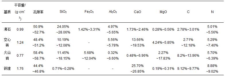沸石、火山巖購(gòu)于北京某濾料廠,沸石粒徑2~5 mm,火山巖粒徑2~10 mm.空心磚來(lái)自北京某工地,鋼渣來(lái)自南昌某鋼廠,研磨過(guò)篩后粒徑為2~5 mm.各填料均用清水清洗,并烘干備用.填料干容重與孔隙率采用標(biāo)準(zhǔn)土壤學(xué)方法測(cè)定.填料的化學(xué)組成采用X射線能譜儀測(cè)定(EX-250,HORIBA公司,日本).4種填料的理化性質(zhì)如表 1所示.