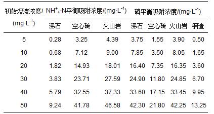 準(zhǔn)確稱(chēng)取沸石、空心磚、火山巖(沸石、空心磚、火山巖、鋼渣)1 g于100 mL的錐形瓶中,分別準(zhǔn)確加入NH+4-N(磷)濃度為0、5、10、20、30、40、50 mg · L-1的NH4Cl(KH2PO4)溶液50 mL,加入2滴氯仿以防止微生物活動(dòng).將樣品置于水浴恒溫振蕩器中,在150 r · min-1、25 ℃的條件下,振蕩時(shí)間24 h,取出樣品測(cè)定NH+4-N(磷)濃度,計(jì)算吸附量.實(shí)驗(yàn)在相同條件下設(shè)置3平行.