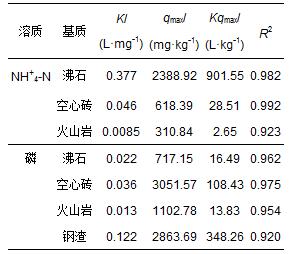 Langmuir等溫吸附模型中的K值為吸附結(jié)合能,K值越大,表示填料與溶質(zhì)的結(jié)合越穩(wěn)定.從表 4可以看出,各填料與NH+4-N之間的結(jié)合能大小順序?yàn)榉惺?gt;空心磚>火山巖;各填料與磷之間的結(jié)合能大小順序?yàn)殇撛?gt;空心磚>沸石>火山巖.Kqmax為最大緩沖容量,反映固液體系吸附溶質(zhì)時(shí)的緩沖能力(趙桂瑜,2007).將各填料進(jìn)行比較,對(duì)NH+4-N緩沖容量最大的填料為沸石,對(duì)磷緩沖容量最大的為鋼渣,空心磚次之.這說(shuō)明即使溶液污染物濃度變化較大時(shí),這些填料對(duì)相應(yīng)污染物仍能維持較好的去除效果.因此,沸石是較好凈化NH+4-N,鋼渣、空心磚是較好的凈化磷的人工濕地填料.