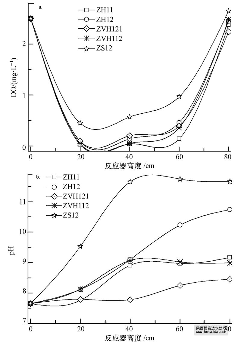 運(yùn)行穩(wěn)定后,反應(yīng)器中不同填料段DO與pH的變化如圖 2所示.DO在各反應(yīng)器分布趨勢(shì)基本相似,在各段的數(shù)值上存在差異.DO在不同填料段的濃度具有明顯的空間特征,導(dǎo)致反應(yīng)器在不同段形成了厭氧、缺氧、好氧交替的環(huán)境,這對(duì)微生物的生物降解、硝化、反硝化作用具有較大的影響.在各反應(yīng)器底部20 cm處DO濃度均在0.5 mg · L-1以下,ZH11、ZH12、ZVH112、ZVH121的填料組合方式中,底部DO濃度達(dá)到了0.2mg · L-1以下.這說(shuō)明當(dāng)污水進(jìn)入反應(yīng)器后,DO被迅速消耗,在各反應(yīng)器0~40 cm間形成了一個(gè)厭氧環(huán)境.同時(shí)隨著反應(yīng)器高度的增加,反應(yīng)器中DO濃度有所升高,在反應(yīng)器頂端接觸空氣處達(dá)到最大值,各反應(yīng)器頂部80 cm處的DO濃度維持在2.24~2.65 mg · L-1之間,這是由于大氣復(fù)氧導(dǎo)致DO濃度的升高.同時(shí),由于該處污水可生化性已經(jīng)較差,污染物不再耗氧分解.