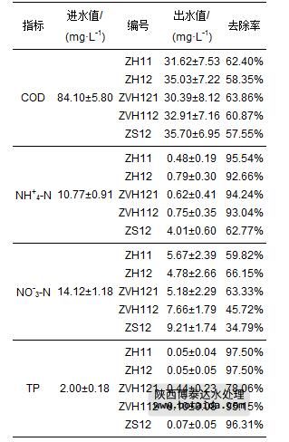 總結(jié)分析各填料組合方式對(duì)污染物的去除效果,效果最好的填料組合方式為ZH11,其對(duì)COD、NH+4-N、NO-3-N、TP的去除率分別達(dá)到62.40%、95.54%、59.82%和97.50%.