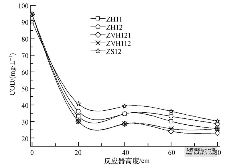 圖 3 COD隨反應(yīng)器高度的變化
