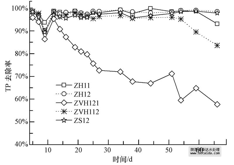 圖 6展示了反應(yīng)器運(yùn)行前70 d,各反應(yīng)器中TP去除率的情況.ZH12、ZH11、ZS12填料組合對(duì)磷一直保持著較高的去除率,而ZVH121、ZVH112填料組合在運(yùn)行期間磷去除率的降低,是因?yàn)樵谠摻M合中空心磚含量較少,在反應(yīng)器運(yùn)行一段時(shí)間后,反應(yīng)器中的空心磚對(duì)磷吸附達(dá)到飽和.含鋼渣的ZS12組合對(duì)磷的去除效果穩(wěn)定且較高,但相比較于其他污染物的去除,鋼渣并不適于在人工濕地處理含磷較低廢水的工程中應(yīng)用.而空心磚不僅能有效地去除磷,且對(duì)氮的去除無(wú)明顯負(fù)作用,適合添加到填料組合中,在不影響其它污染物去除效果的同時(shí),用于提高人工濕地中磷的去除效果.