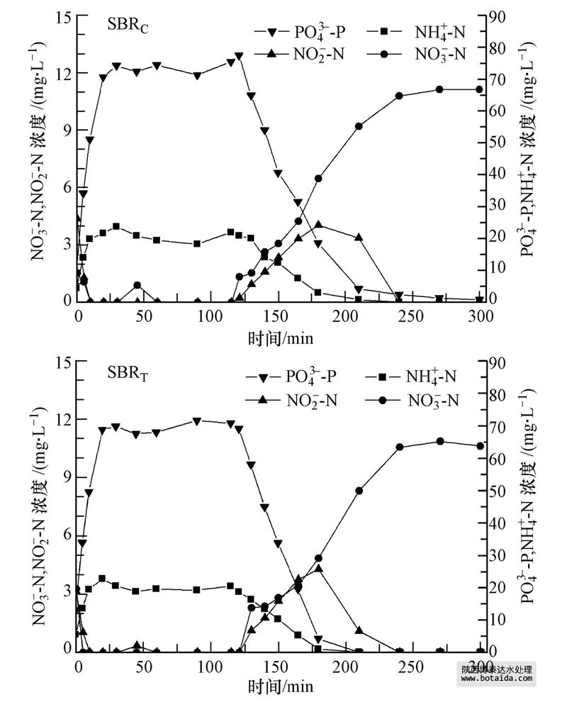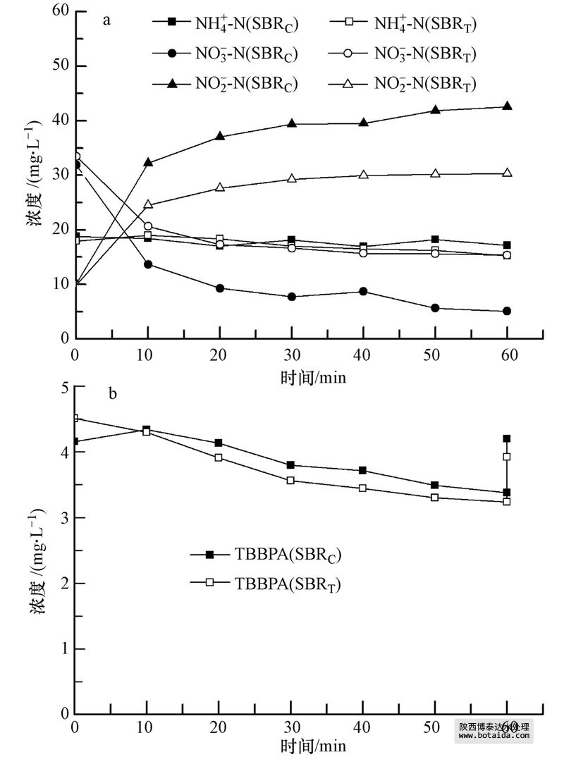 兩套SBR反應(yīng)器穩(wěn)定運(yùn)行狀態(tài)下,出水乙酸鈉和亞硝酸鹽濃度低于檢測(cè)方法的檢出限,出水PO3-4-P,NH+4-N濃度均小于0.5 mg · L-1,反應(yīng)器具有良好的脫氮除磷功能;SBRC反應(yīng)器出水NO-3-N濃度為(12.9±2.2)mg · L-1,SBRT反應(yīng)器出水NO-3-N濃度為(15.3±2.0)mg · L-1.表明TBBPA對(duì)SBR反應(yīng)器硝化和除磷效率沒(méi)有太大影響,但對(duì)出水硝態(tài)氮濃度略有影響.