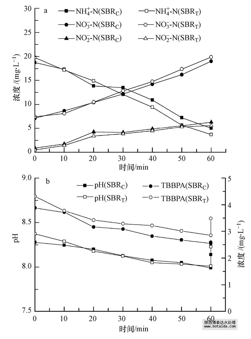 圖 4 批處理試驗(yàn)硝化過(guò)程中N(a)和TBBPA濃度(b)以及pH(b)變化圖