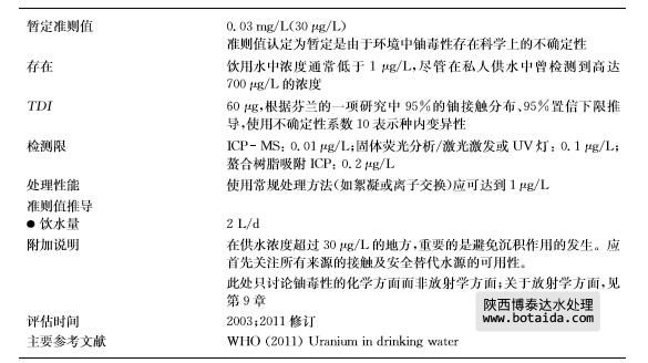 根據(jù)人群接觸高濃度鈾的新的流行病學(xué)研究推導(dǎo)的30μg /L的暫定準(zhǔn)則值,代替原先 根據(jù)實(shí)驗(yàn)動(dòng)物研究推導(dǎo)的暫定準(zhǔn)則值。被認(rèn)定為是基于有關(guān)鈾的毒理學(xué)和流行病學(xué)上的不 確定性以及要實(shí)現(xiàn)更低濃度供應(yīng)在技術(shù)上的困難度。要注意的是,有關(guān)人類群體的研究如 可獲取且質(zhì)優(yōu),則為用于推導(dǎo)健康準(zhǔn)則值相關(guān)信息的首選來源