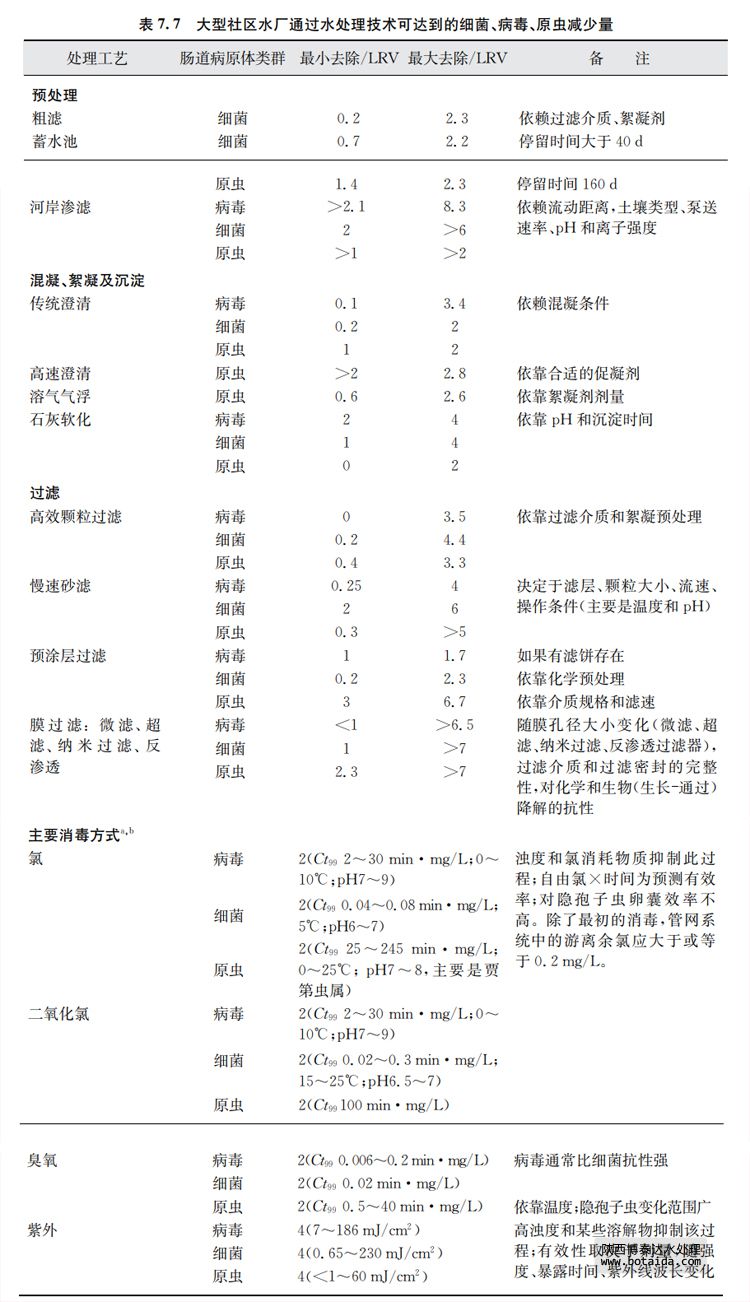 很高質(zhì)量的水,例如來(lái)自封閉含水層的地下水,可能主要依靠對(duì)水源水和配水系統(tǒng)的保護(hù) 作為主要的控制措施來(lái)保證用水安全。更常見(jiàn)的是實(shí)施水處理以清除或殺滅病原體。大多情 況下(如水質(zhì)差的地表水),需要對(duì)水進(jìn)行多道工序處理,如混凝、絮凝、沉淀、過(guò)濾和消毒。表 7.7對(duì)水處理工藝進(jìn)行了總結(jié),這些工藝有時(shí)單獨(dú)使用、有時(shí)聯(lián)合使用以去除微生物(也見(jiàn)附錄 5)。最小和最大的去除量用lg表示,它們分別在故障或者最佳處理?xiàng)l件下出現(xiàn)。
