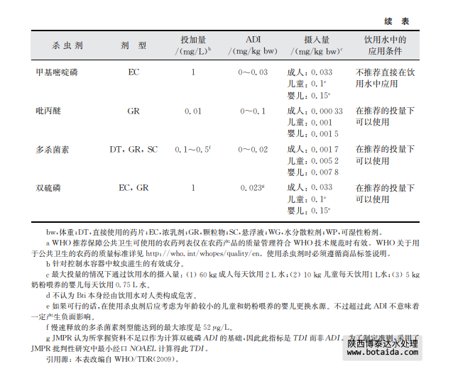 雖然沒(méi)必要為以控制攜菌體為目的的農(nóng)藥設(shè)定準(zhǔn)則值,但有必要就它們使用時(shí)的安全 性提供足夠的信息。用于飲用水?dāng)y菌體控制的農(nóng)藥劑型必須嚴(yán)格遵守商品標(biāo)簽建議,并且 包括從材料到配制最終產(chǎn)品的配方組分,一定要使用國(guó)家主管部門批準(zhǔn)可用于此用途的產(chǎn) 品。為制定準(zhǔn)則評(píng)估控制攜菌體的農(nóng)藥時(shí),評(píng)價(jià)報(bào)告主要由犃犇犐與潛在暴露風(fēng)險(xiǎn)的比較組 成。不過(guò),超過(guò)犃犇犐的攝入不一定意味著會(huì)對(duì)健康產(chǎn)生負(fù)面影響。由于攜菌體傳播的疾病 有很高的發(fā)病率和死亡率,控制病原昆蟲與飲用水?dāng)z入農(nóng)藥量之間必須找到一個(gè)合適的平 衡。需要強(qiáng)調(diào)的是,應(yīng)努力使總攝入量和任何殺幼蟲劑的濃度都低于 WHOPES的推薦水 平,并且在具有足夠的效力條件下盡可能低。