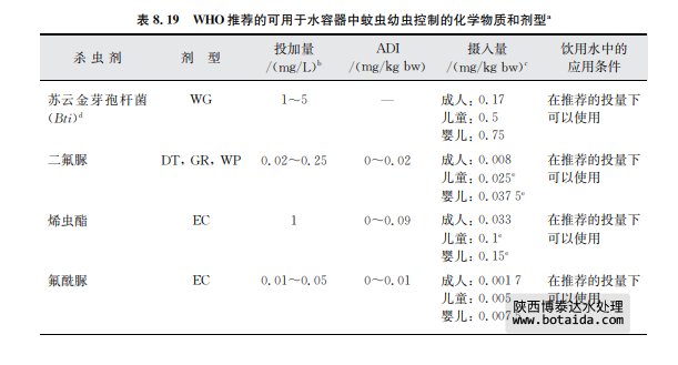 在許多國(guó)家,控制以昆蟲為媒介傳播的疾?。ㄈ绲歉餆幔┓浅V匾⑶覕y菌體(尤其是 蚊子)有機(jī)會(huì)在飲用水的貯藏和采集容器中產(chǎn)卵。盡管必須有防止這些攜菌體進(jìn)入或在這 類容器中產(chǎn)卵的措施,但這種方式不可能完全有效或不能一直有效,在某些情況下就需要使 用蚊蟲幼蟲殺滅劑。