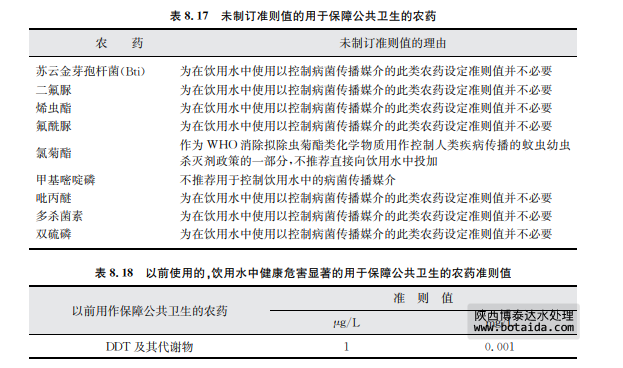 表8.17列舉了尚未制訂準(zhǔn)則值用于保障公共衛(wèi)生的農(nóng)藥。二氯二苯基三氯乙烷 (DDT)在過(guò)去常被使用以保障公共衛(wèi)生,現(xiàn)在在某些地區(qū)將DDT再次引入以控制攜帶瘧疾 的蚊蟲(但不應(yīng)用在飲用水領(lǐng)域)。表8.18列出了DDT的準(zhǔn)則值。表8.19列舉了各種殺 蟲劑產(chǎn)品的劑型,投量比和相應(yīng)的攝入量。 準(zhǔn)則中所涉及的殺幼蟲劑的資料概覽詳見第12章