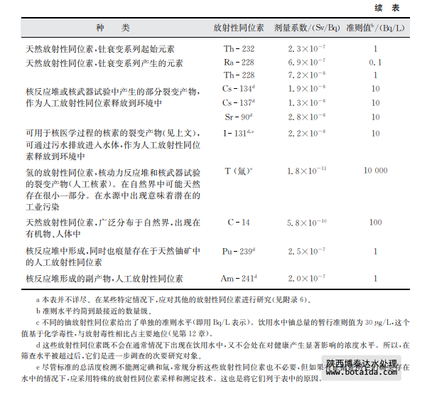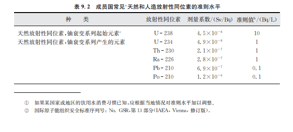 從放射學(xué)的角度,超過(guò)準(zhǔn)則值的程度也是一個(gè)需要考慮的關(guān)鍵問題。防護(hù)電離輻射和輻 射源安全的國(guó)際基本安全標(biāo)準(zhǔn)在有關(guān)現(xiàn)有暴露的章節(jié)提到了飲用水并提出由使用飲用水帶來(lái) 的個(gè)人年最高輻射劑量最大不能超過(guò)約1mSv②。這一水平不應(yīng)被當(dāng)作“可接受的”水平或限 制性水平,并應(yīng)盡可能地采取有效措施減少受到的輻射水平。每種超過(guò)準(zhǔn)則水平的情況不同, 在做出最后的決定之前還需要考慮一些非放射方面的因素(如補(bǔ)救措施的經(jīng)濟(jì)成本、其他供水 源的實(shí)用性)。政府的有關(guān)部門應(yīng)意識(shí)到,放射性同位素(如鈾)同時(shí)具有化學(xué)毒性,那么在水 中的允許濃度可能需要以其同位素的毒性確定,而不是依據(jù)放射性(見第12章)。