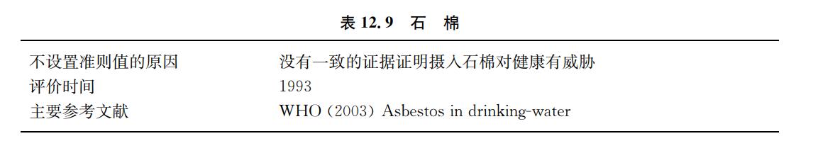 水中的石棉來自含石棉的材料和礦石在水中的分解,也來自工業(yè)排放物以及大氣污染 和供水系統(tǒng)中的石棉 水泥管道。石棉纖維從石棉 水泥管剝落可對水的供應(yīng)造成威脅。有 限的資料顯示,在淋浴或空氣潮濕時,從自來水釋放到大氣的石棉暴露量可以忽略不計(見 表12.9)。