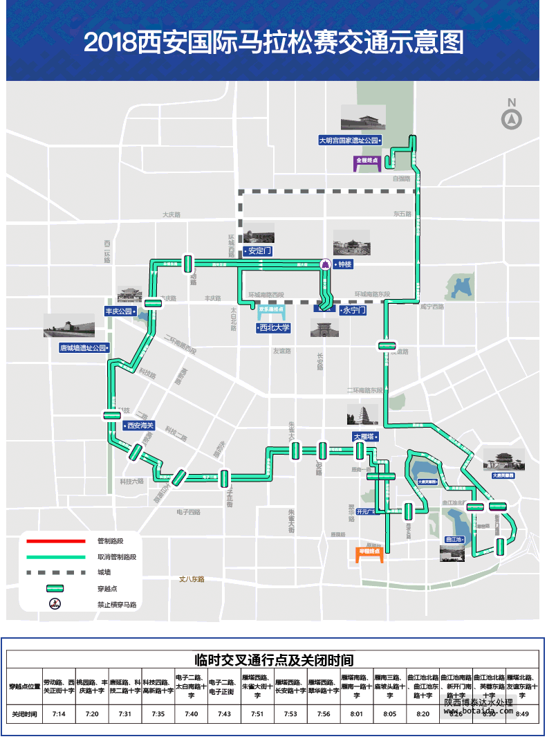 (2)、10月19日22時至比賽結(jié)束,長安路(南門至南稍門段)、南門盤道、南大街(粉巷至南門盤道段)、雁塔南路(雁南四路至南三環(huán)段)、雁南五路(翠華路至楓林溪園西門段),實(shí)行交通管制。