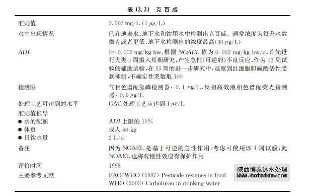 克百威(CASNo.1563 66 2)作為一種在世界各地廣泛使用的農(nóng)藥,對(duì)多種農(nóng)作物起 作用。噴灑于作物上的克百威殘留量通常非常低或低于檢測(cè)限(見(jiàn)表12.21)。克百威的理 化性質(zhì)以及現(xiàn)有的少量資料顯示,來(lái)自地下水和地面水源的飲用水可能是克百威的主要攝 入途徑。